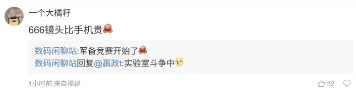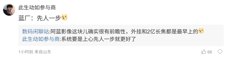 后续有用户在评论区表示:“蓝厂:先人一步”,博主回复道:“阿蓝影像这块儿确实很有前瞻性,外挂和2亿长焦都是最早上的[狗头斜眼]”;另一名用户则表示:“666镜头比手机贵”,博主则表示:“军备竞赛开始了”。
