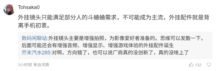 值得注意的是,博主在今天中午也发布过类似的言论,当时他在“外挂配件就是背离手机初衷”的相关言论下方回复道:“外挂镜头主要是增强拍照,为影像爱好者准备的。思维可以发散一下,后面可能还会有增强音频、增强显示、增强游戏体验的外挂配件诞生”。